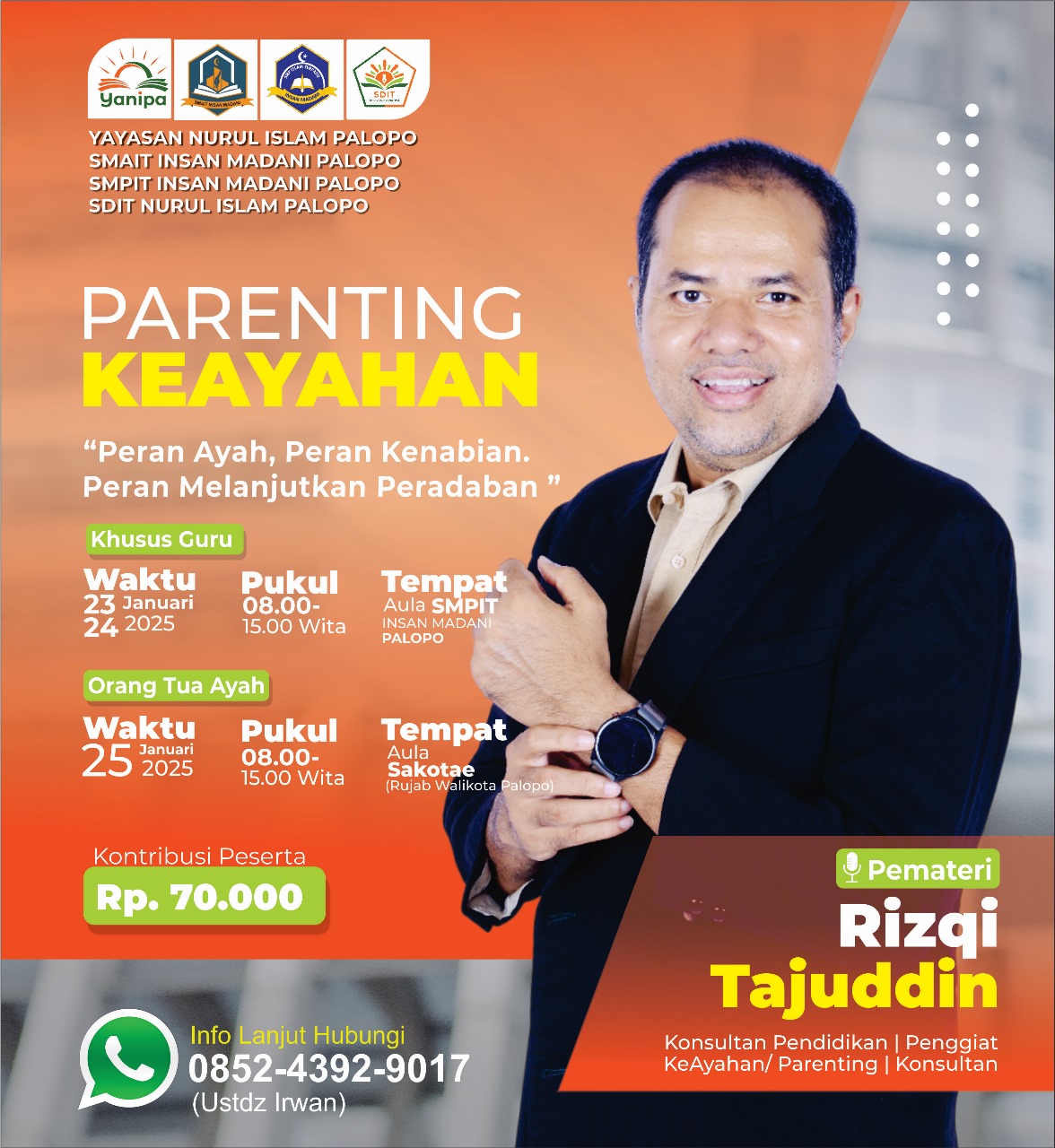 “Kami dari Yayasan Nurul Islam Palopo yang tergabung dengan SDIT Nurul Islam, SMPIT Insan Madani Palopo dan SMAIT Insan Madani Palopo akan melaksanakan kegiatan Parenting. Maka kami mengajak seluruh Ayah yang hebat se-Luwu Raya untuk ikut kegiatan Parenting Keayahan dalam mendidik anak-anak kita lebih baik,” ujarnya saat diwawancarai tim indeksmedia.id.