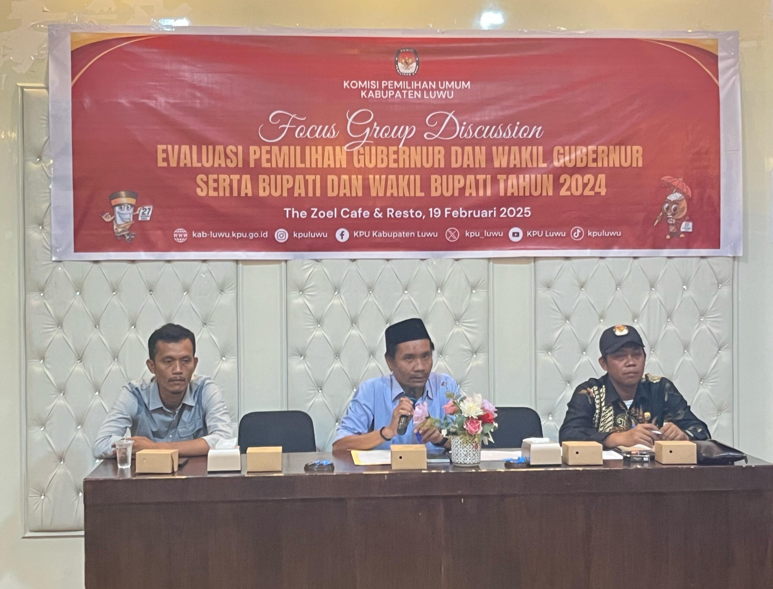 LUWU, INDEKSMEDIA – KPU Kabupaten Luwu menggelar Focus Group Discussion (FGD) evaluasi penyelenggaraan Pemilihan Kepala Daerah 2024 di The Zoel Cafe and Resto. Kegiatan ini dihadiri Polres Luwu, Kejaksaan Negeri Luwu, Pengadilan Negeri Luwu, Bawaslu, Dukcapil, dan anggota DPRD Luwu.