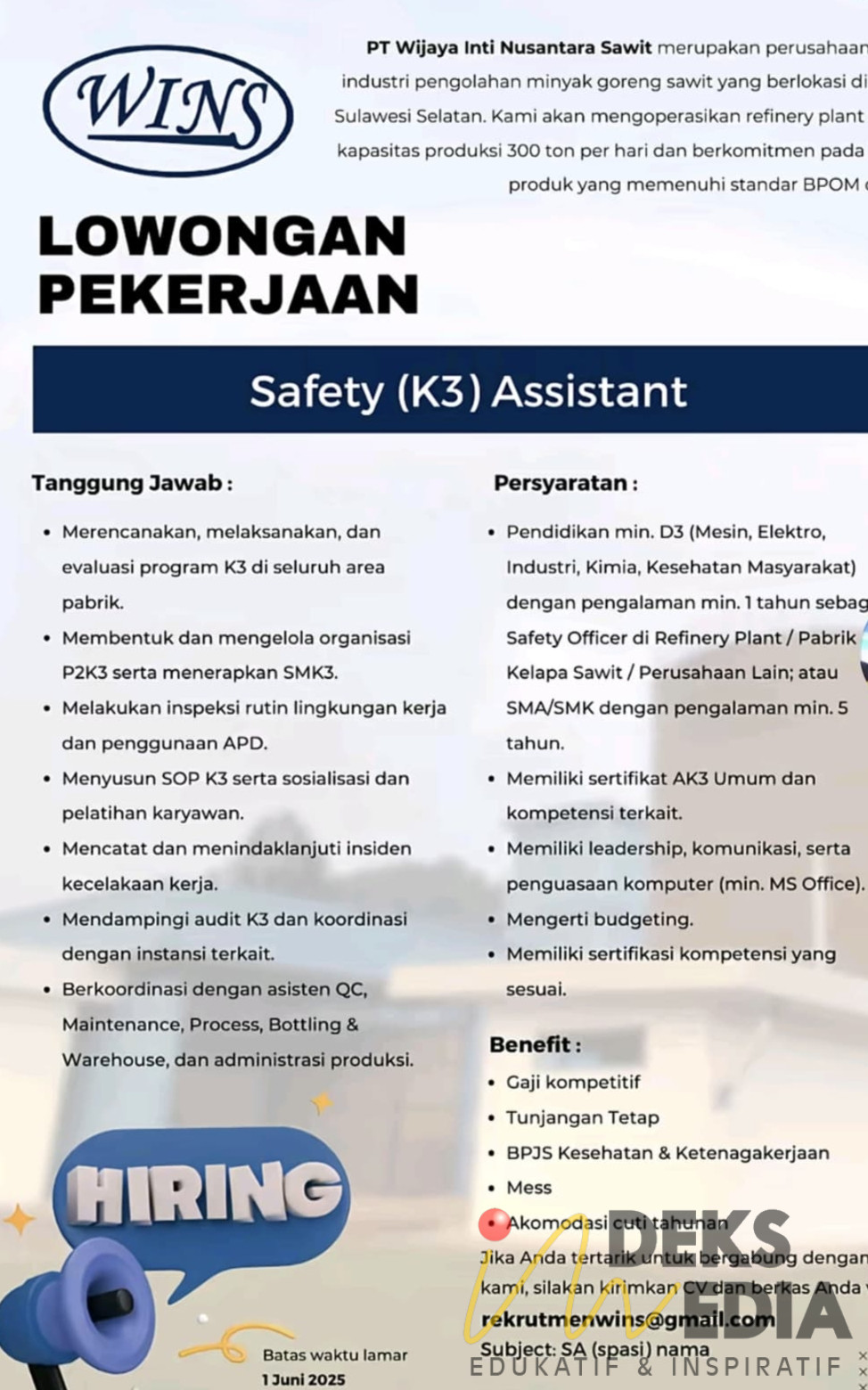 Hal tersebut guna memberikan kenyamanan (Safety K3 Assistant) bagi seluruh pekerja dan karyawan yang nantinya bekerja di perusahaan.
