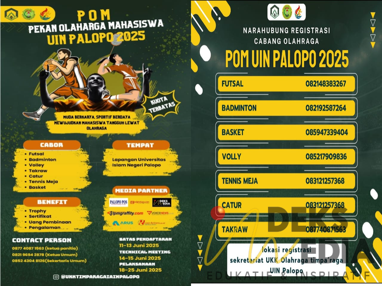 POM UIN Palopo 2025 akan dilangsungkan pada 18–25 Juni 2025 di Lapangan UIN Palopo. Pendaftaran dibuka mulai 11 Juni dan akan ditutup pada 13 Juni 2025, disusul technical meeting pada 14–15 Juni.