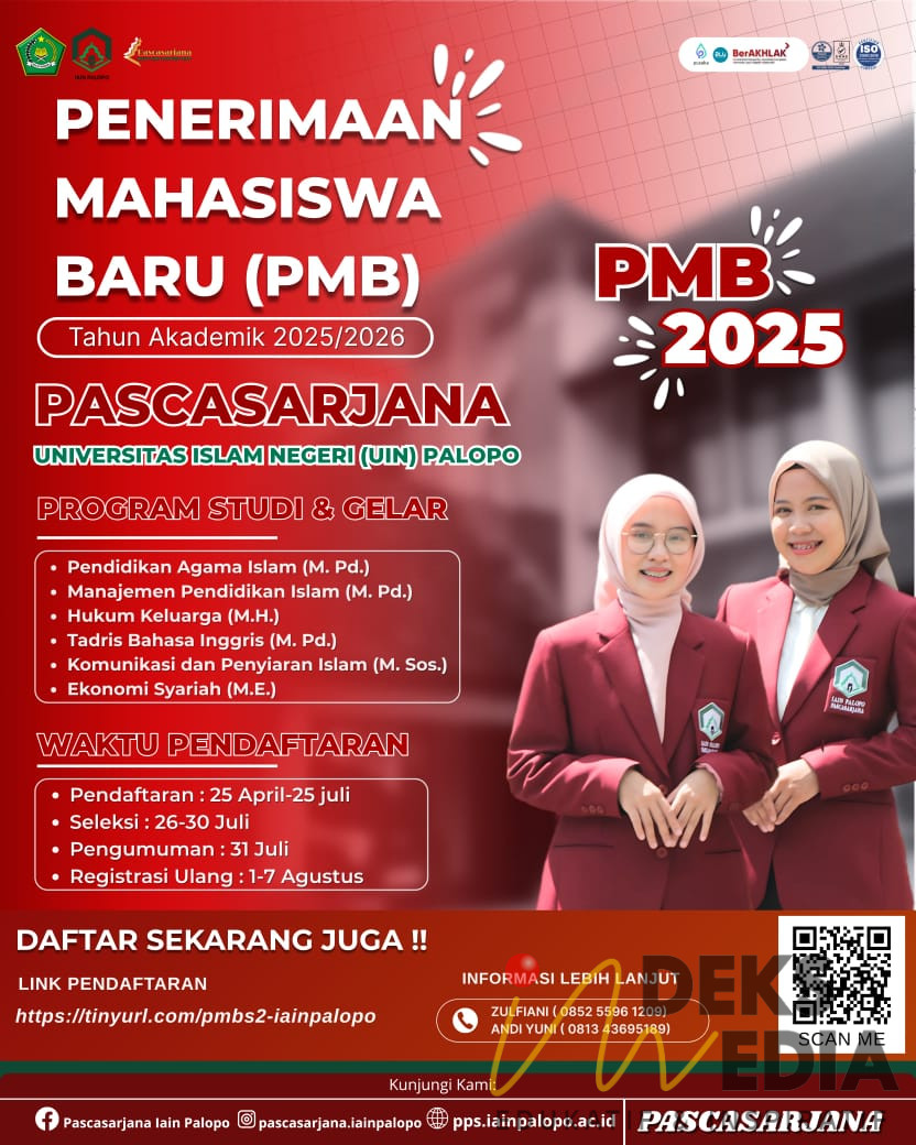 PALOPO INDEKSMEDIA.ID – Universitas Islam Negeri (UIN) Palopo kembali membuka Penerimaan Mahasiswa Baru (PMB) Program Pascasarjana untuk Tahun Akademik 2025/2026. Pendaftaran telah resmi dibuka mulai tanggal 25 April hingga 25 Juli 2025, dan terbuka bagi lulusan S1 dari berbagai latar belakang yang ingin melanjutkan studi magister (S2) di lingkungan akademik yang religius, intelektual, dan berdaya saing global.