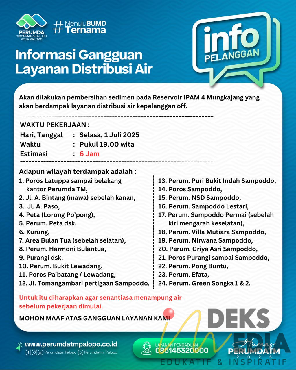 Perumda mengimbau warga di wilayah yang disebutkan agar menampung air secukupnya sebelum waktu pekerjaan dimulai.