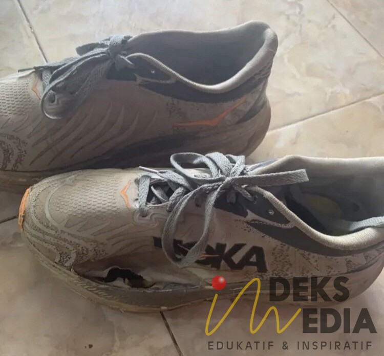 Pada postingan tersebut, memperlihatkan sebuah sepatu merek Hoka yang robek dibagian samping.