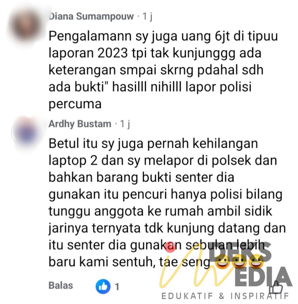 “Pengalaman saya juga uang 6 juta ditipu, laporan 2023 tapi tak kunjung ada keterangan sampai sekarang padahal sudah ada bukti. Hasilnya nihil, lapor polisi percuma,” keluh Diana.