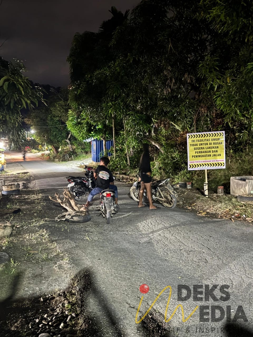 Sebuah motor terparkir di jalan dan tumpukan ban bekas di bahu jalan. Kemudian ada terpampang spanduk yang bertuliskan “Ini Fasilitas Umum Tidak Untuk di Rusak Segera Lakukan Perbaikan dan Peningkatan Jalan”.