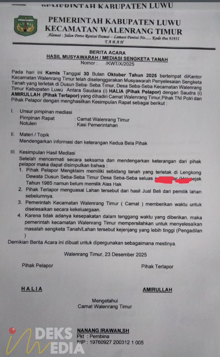 PALOPO,INDEKSMEDIA.ID – Masih ingat dengan kasus sengketa lahan yang melibatkan Jurusita Pengadilan Negeri (PN) Palopo, Amirullah?. Lama tak ada kabar, kini kasus tersebut kembali muncul. Itu setelah warga Marobo, Kelurahan Salubattang, Kecamatan Telluwanua Kota Palopo, menerima rekomendasi berita acara dari Kecamatan Walenrang Timur (Waltim) Kabupaten Luwu, yang dalam isi surat rekoemdasi tertera poin-poin hasil pertemuan yang telah dilakukan kedua bela pihak.