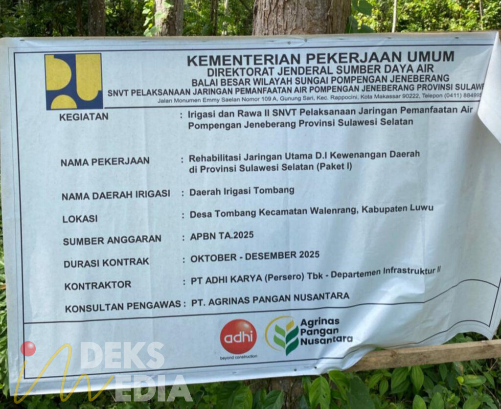 LUWU, INDEKSMEDIA.ID – Proyek rehabilitasi jaringan irigasi Daerah Irigasi (DI) Tombang di Desa Tombang, Kecamatan Walenrang, Kabupaten Luwu, menuai kecaman keras dari warga. Proyek yang dibiayai melalui Anggaran Pendapatan dan Belanja Negara (APBN) Tahun Anggaran 2025 tersebut dinilai gagal berfungsi meskipun masa kontrak pekerjaan telah berakhir.