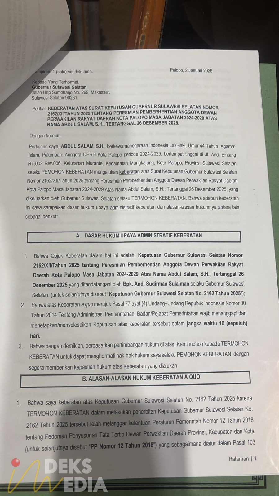 PALOPO,INDEKSMEDIA.ID – Abdul Salam, keberatan atas surat pemberhentiannya sebagai anggota DPRD Kota Palopo. Diapun mengajukan surat keberatan kepada Gubernur Sulsel, Andi Sudirman Sulaiman.