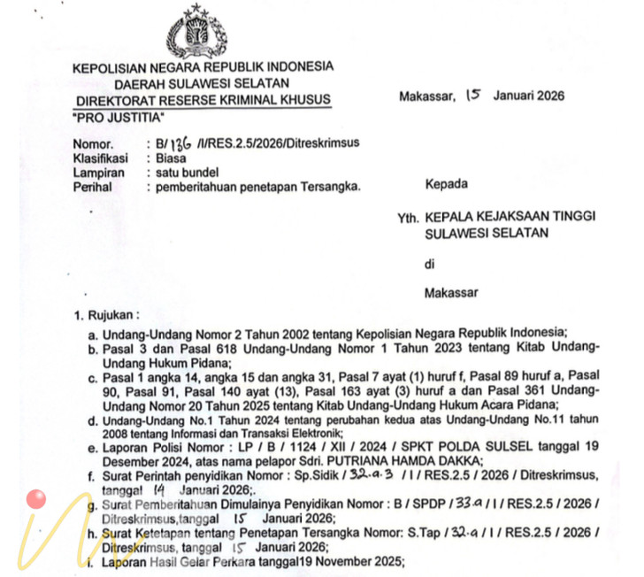 Laporan tersebut dibuat Putri Dakka di Polda Sulsel pada Kamis (19/12) sekitar pukul 17.10 Wita dengan Nomor: LP/B/1124/XII/2024/SPKT/POLDA SULAWESI SELATAN.