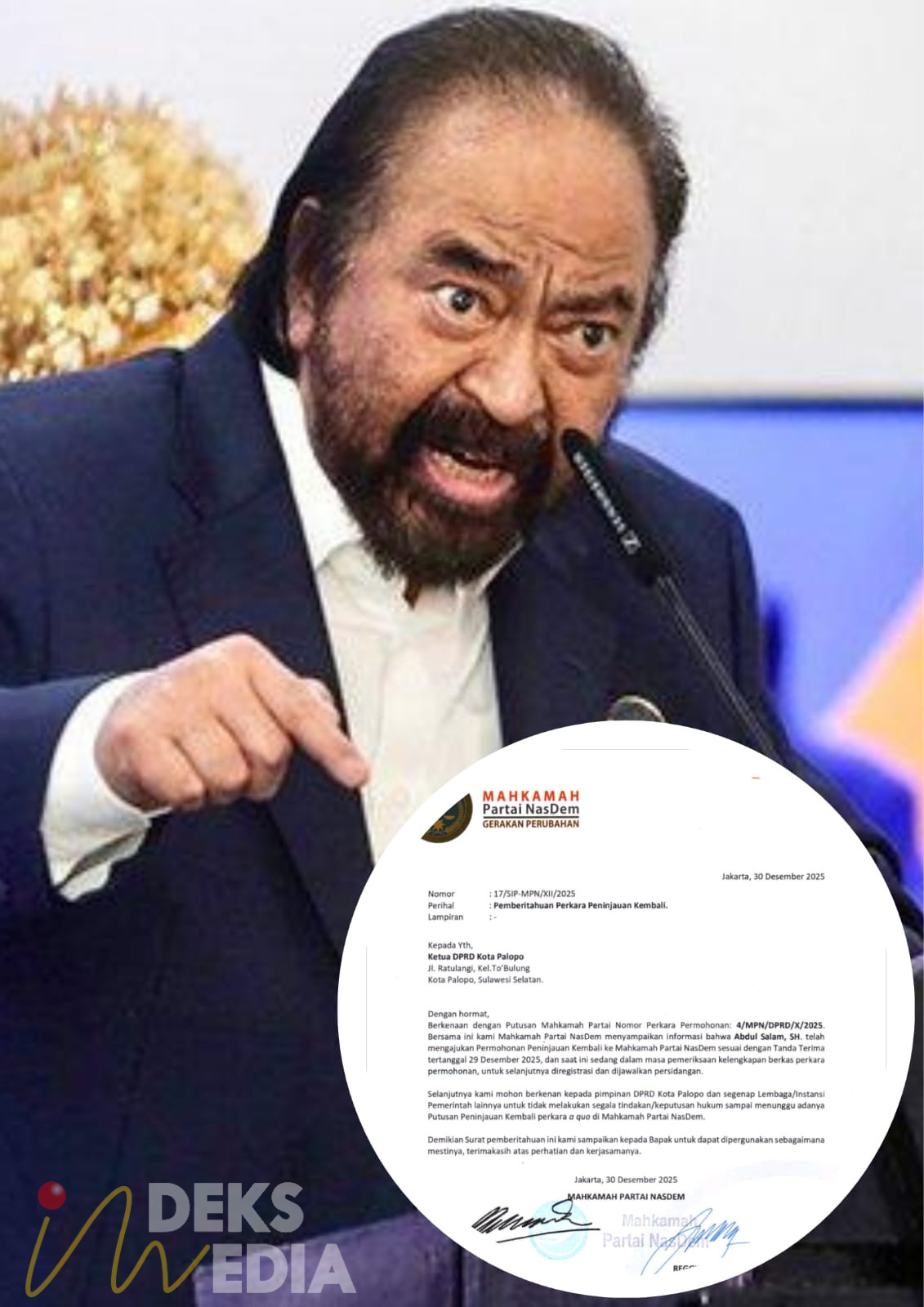 Namun, cerita tidak berhenti di situ. Pada 29 Desember 2025, Abdul Salam mengajukan Peninjauan Kembali (PK) ke MPN. Surat pemberitahuan MPN Nomor 17/SIP-MPN/XII/2025 tertanggal 30 Desember 2025 menyatakan permohonan diterima, sedang diperiksa, dan meminta status quo: tidak ada tindakan hukum atau pelaksanaan apa pun sampai putusan PK final. Di mata sebagian pihak, SK Surya Paloh yang ditandatangani dengan tinta tebal seakan kehilangan makna di hadapan lembaga internal yang sama yakni Mahkamah Partai Nasdem.