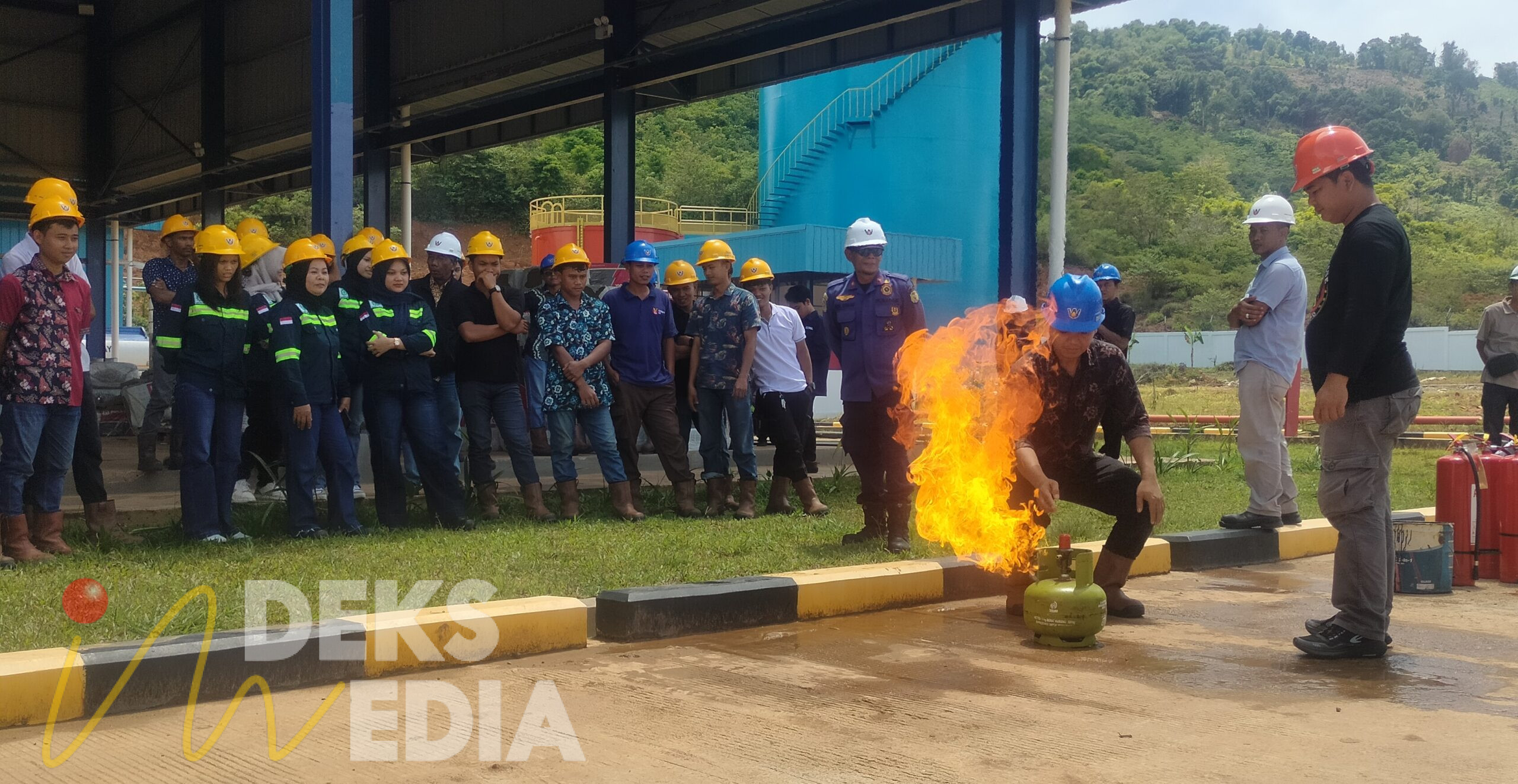 SIMULASI memadamkan api tabung LPG 3 Kg di halaman PT WINS, Jumat (13/02/2026).